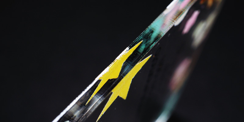 ■フルカラー印刷を使えば擬似的にカラーアクリルのような仕上がりになりますが、印刷部分は透明度が下がりすりガラスのような質感になります。