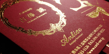 赤い特殊紙に箔押し加工。高級感あふれる名刺です。