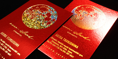 赤い特殊紙に箔押し加工。高級感あふれる名刺です。